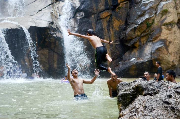 Happiness is becoming one with nature. Happiness is having friends that you trust. Happiness is being carefree and young at heart. //A group of friends take turns to dive into the water at Sungai Lembing, Malaysia.