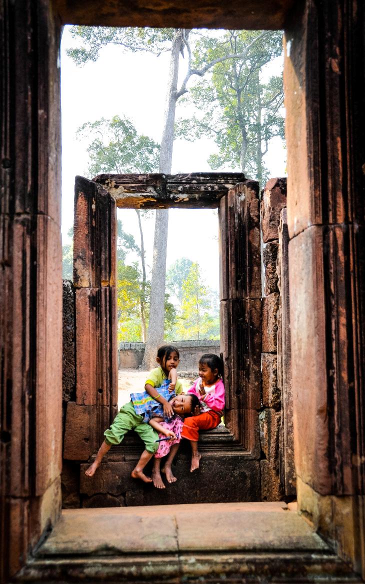 This photo was taken on one of my exploration trips to Cambodia. We were at a preserved ruins of a palace, when I noticed these poor kids with their innocent and true smile, making me realize that we should be happy & Thankful to God for whatever we have. I was able to "frame" these kids in what was a series of Stone doorways and capture what to me is real happiness coming from contentment. Thanks. SG