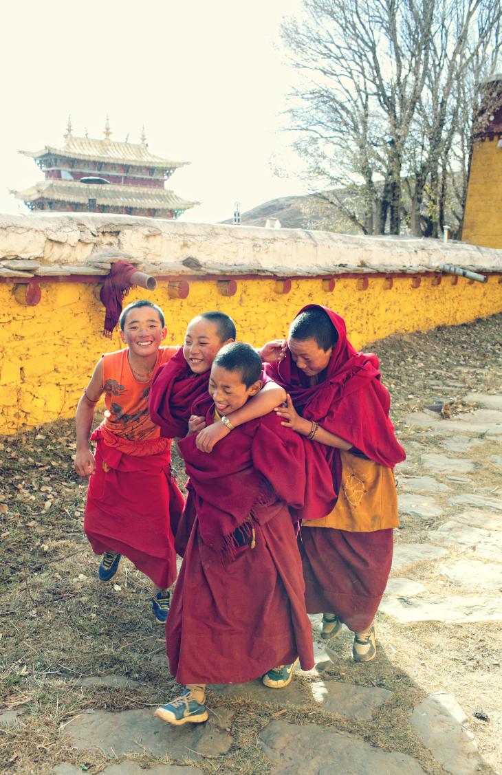 novice monks playing on the first day of winter carefree and content