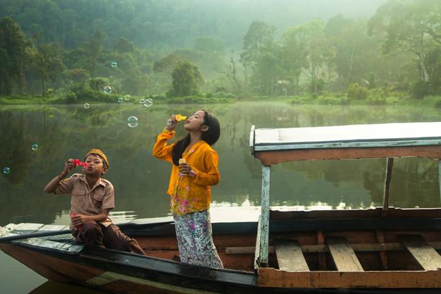 The beautiful scene behind the happy kids is Lake Situ Gunung of West Java. Local dresses were used by those kids. And The Sun just came up and hit the mist.