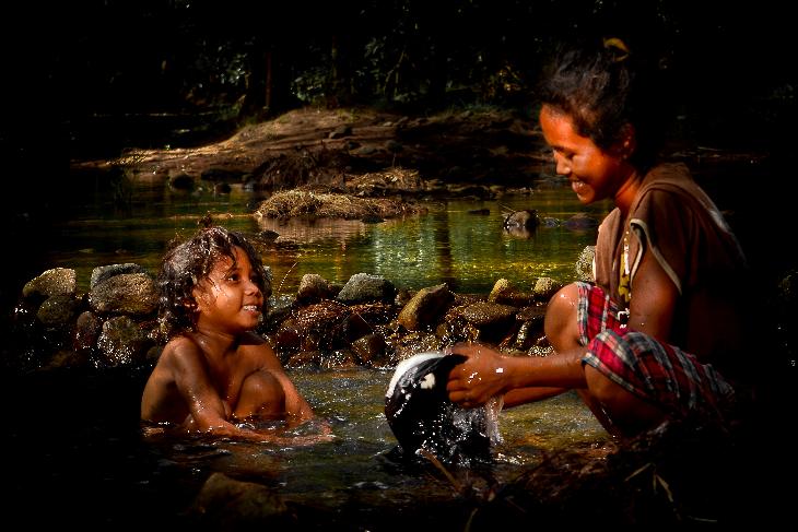 An Aeta mother and daughter bonding moment, washing their clothes in the forest river. Although a primitive way of life, but this brought them happiness in their simple and naive life.