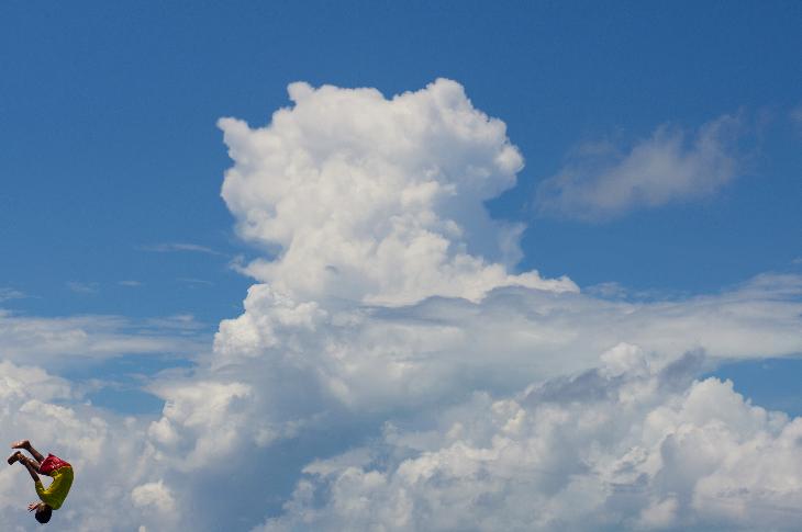 A sea gypsy child jumps of happiness near his home in Omadal Island, Sabah