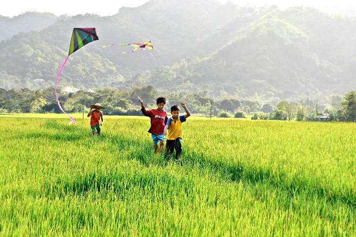 Simple rural life as a child is more fun like these kids playing and flying kites in the green rice fields.