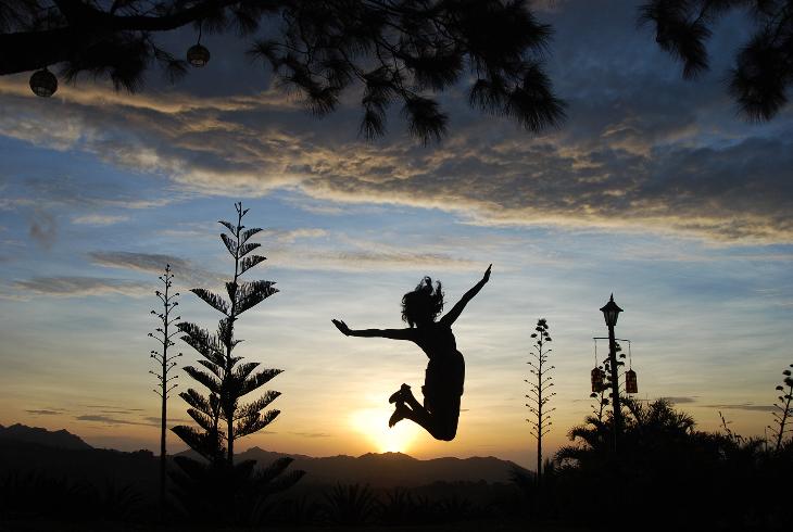 Beautiful views are part of what gives happiness on a trip. My friend was so overjoyed with this breathtaking sunset, she thought a jump would show more happiness than just a smile.