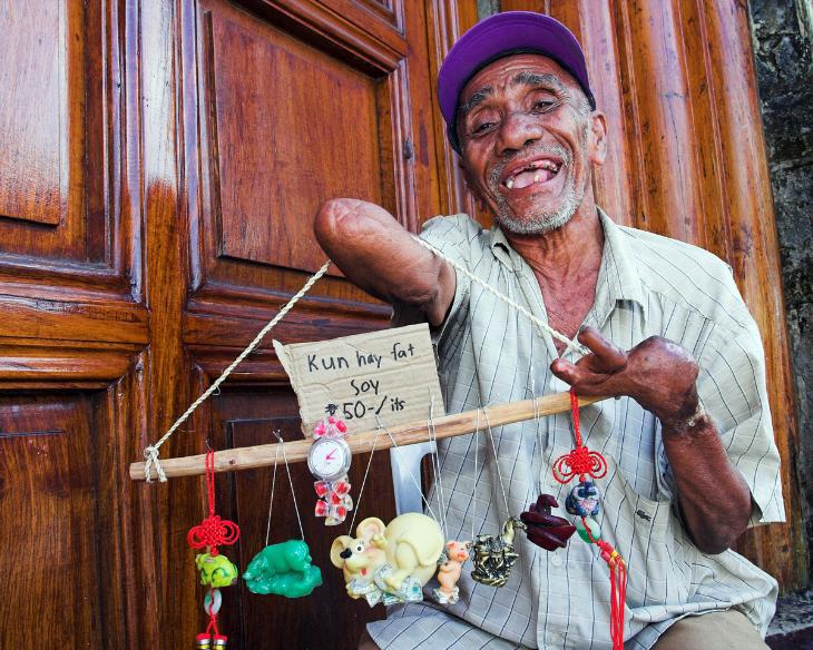 A vendor of figurines enjoying his daily trade.