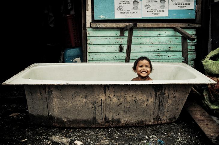 A young child in Ulingan, Tondo Manila take a dip in an old bath tub.