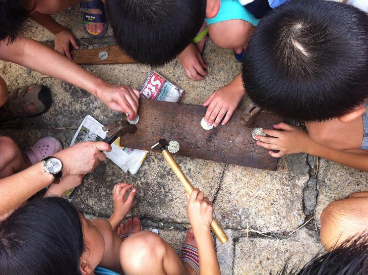 Happiness can be as simple as playing bottle cap slicer together with a bunch of childhood friends. In this photo, the kids are enjoying toys making their own bottle cap for the "battle" later.